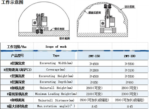 配備銑挖頭後,可在硬度4F的煤巷或半煤巷掘進時工作,無需炮掘。本機帶有快速連接器,岩 巷掘進時挖鬥和銑挖頭互換,爆破後用挖鬥裝渣,實現了一機兩用;